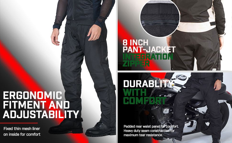 Outer shell of these motorcycles over pants men’s is made from highly durable and abrasion resistant 600 Denier textile fabrics. The shell also has a fixed thin mesh liner on inside for comfort. Two belt loops and Motorcycle Jacket connection zipper on these motorcycle riding pants for men add to the comfort and safety. These dirt bike gear pants have adjustable cuff that will snug up to your boots and block cold air.