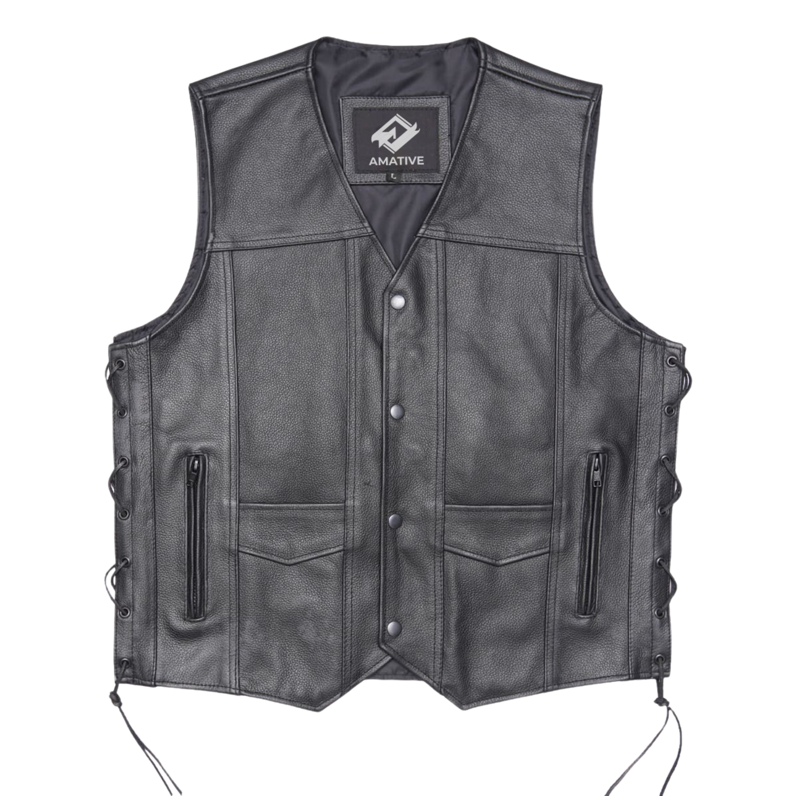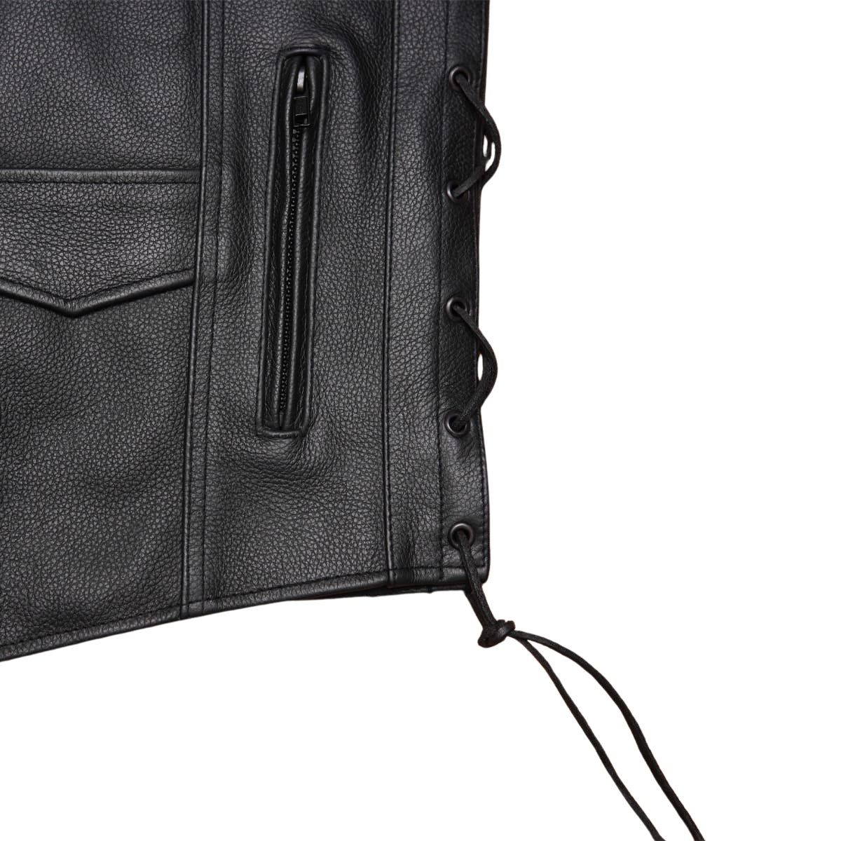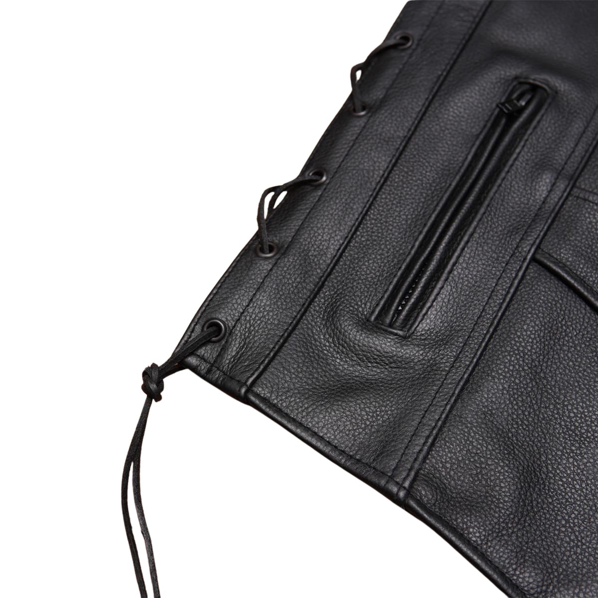 Our black motorcycle leather vest for men has side laces, allowing you to customize the fit according to your preference.