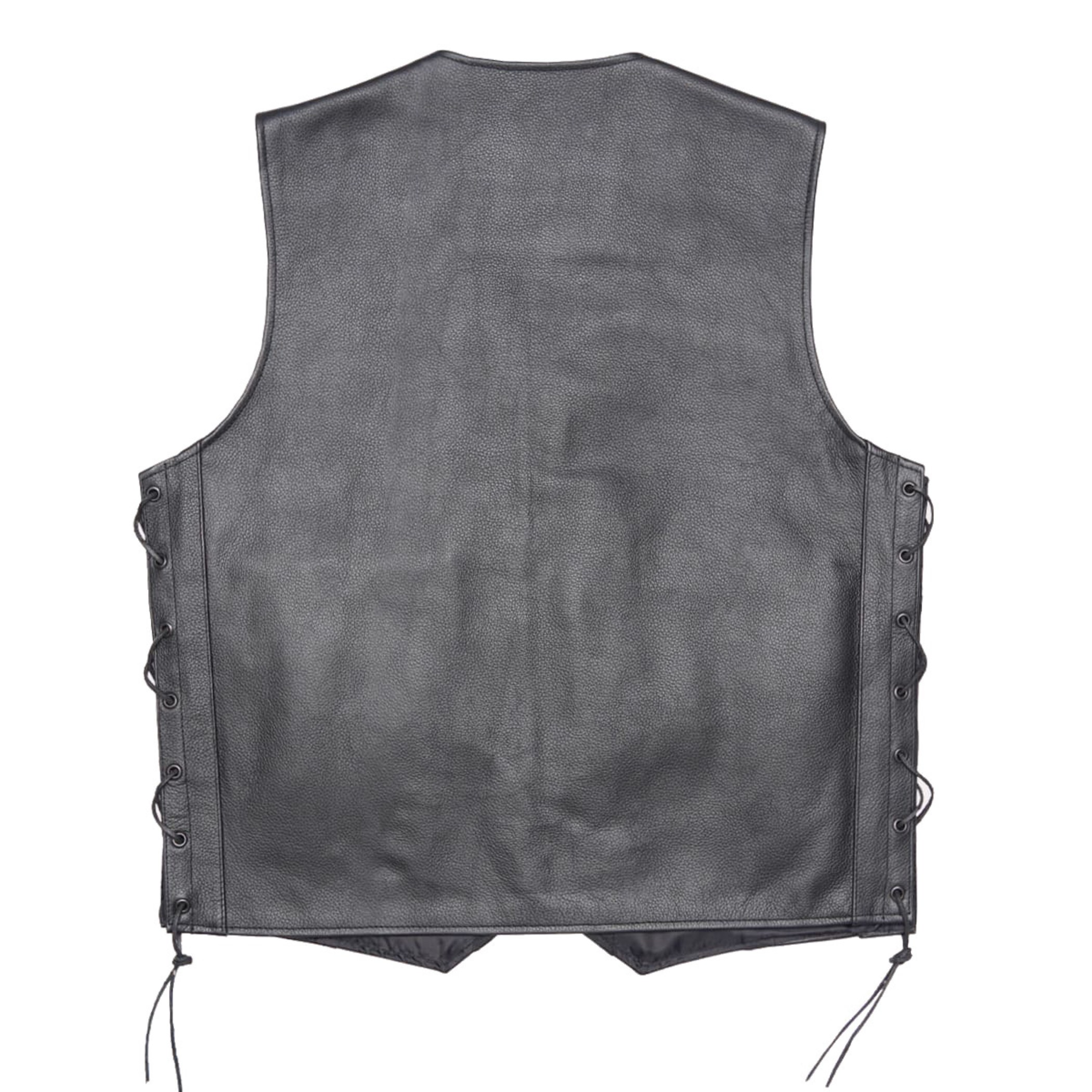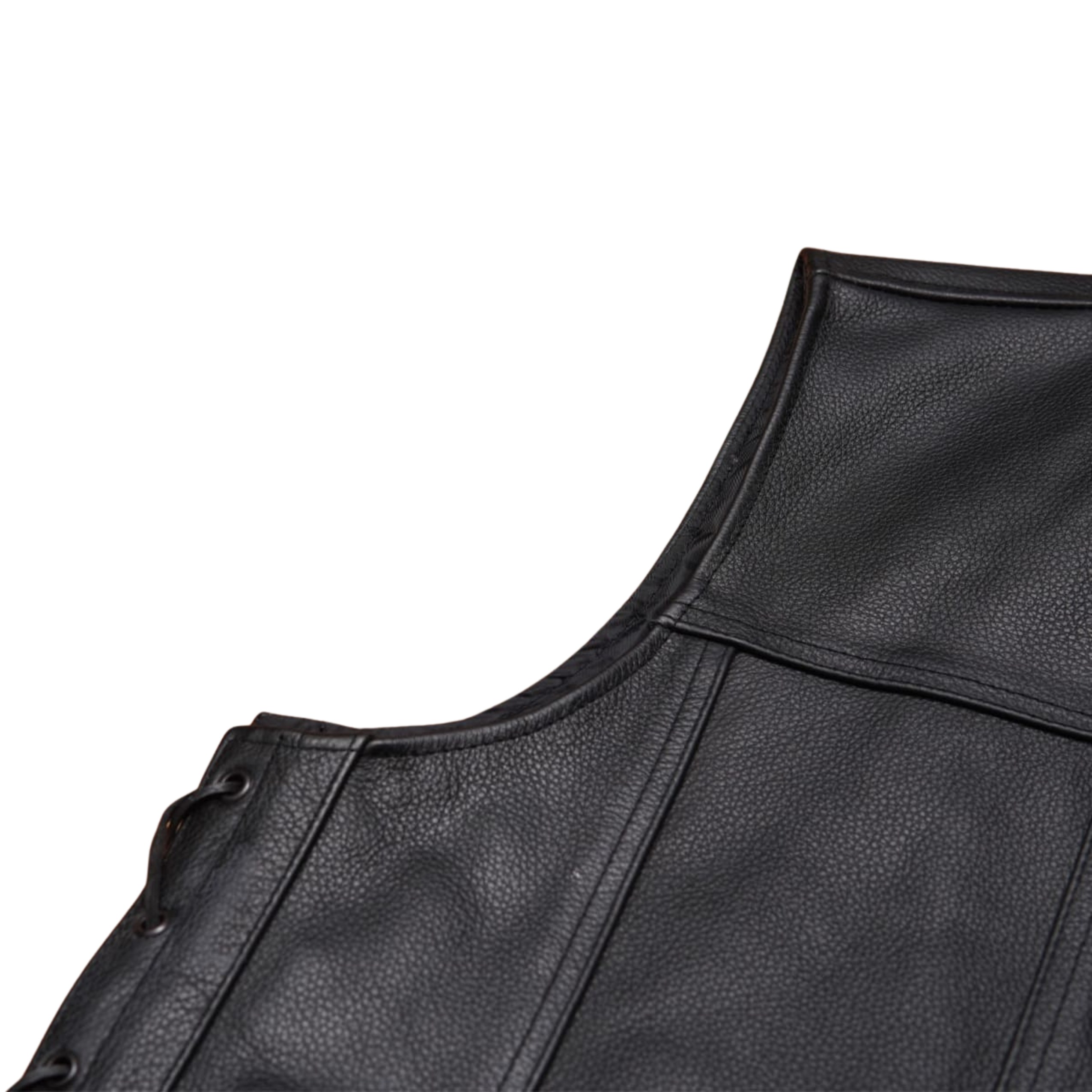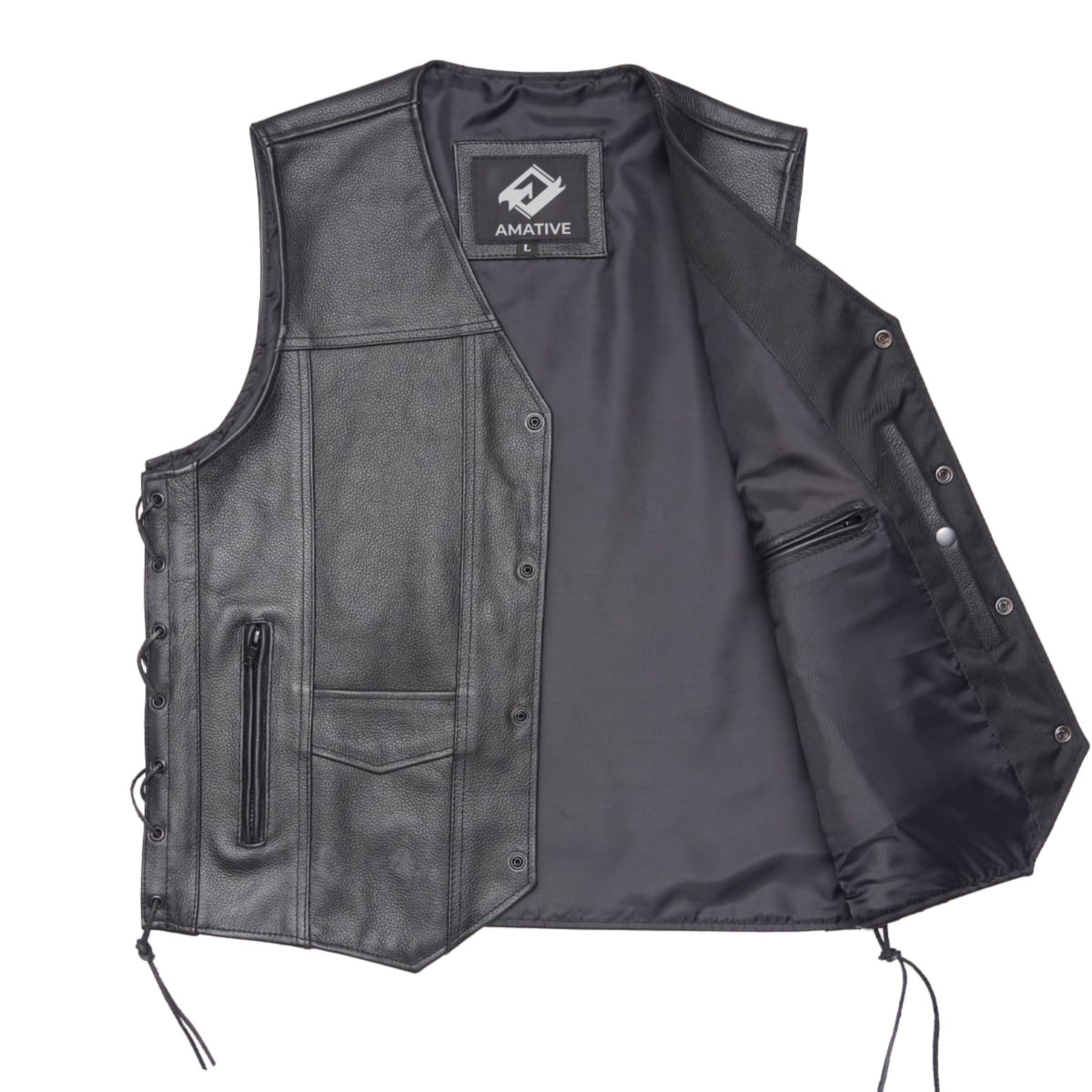 Our black motorcycle leather vest for men has side laces, allowing you to customize the fit according to your preference.